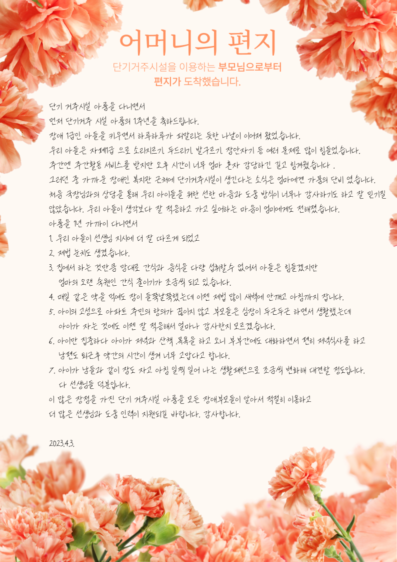 그러던 중 가까운 장애인 복지관 근처에 단기거주시설이 생긴다는 소식은 엄마에겐 가뭄의 단비 였습니다.