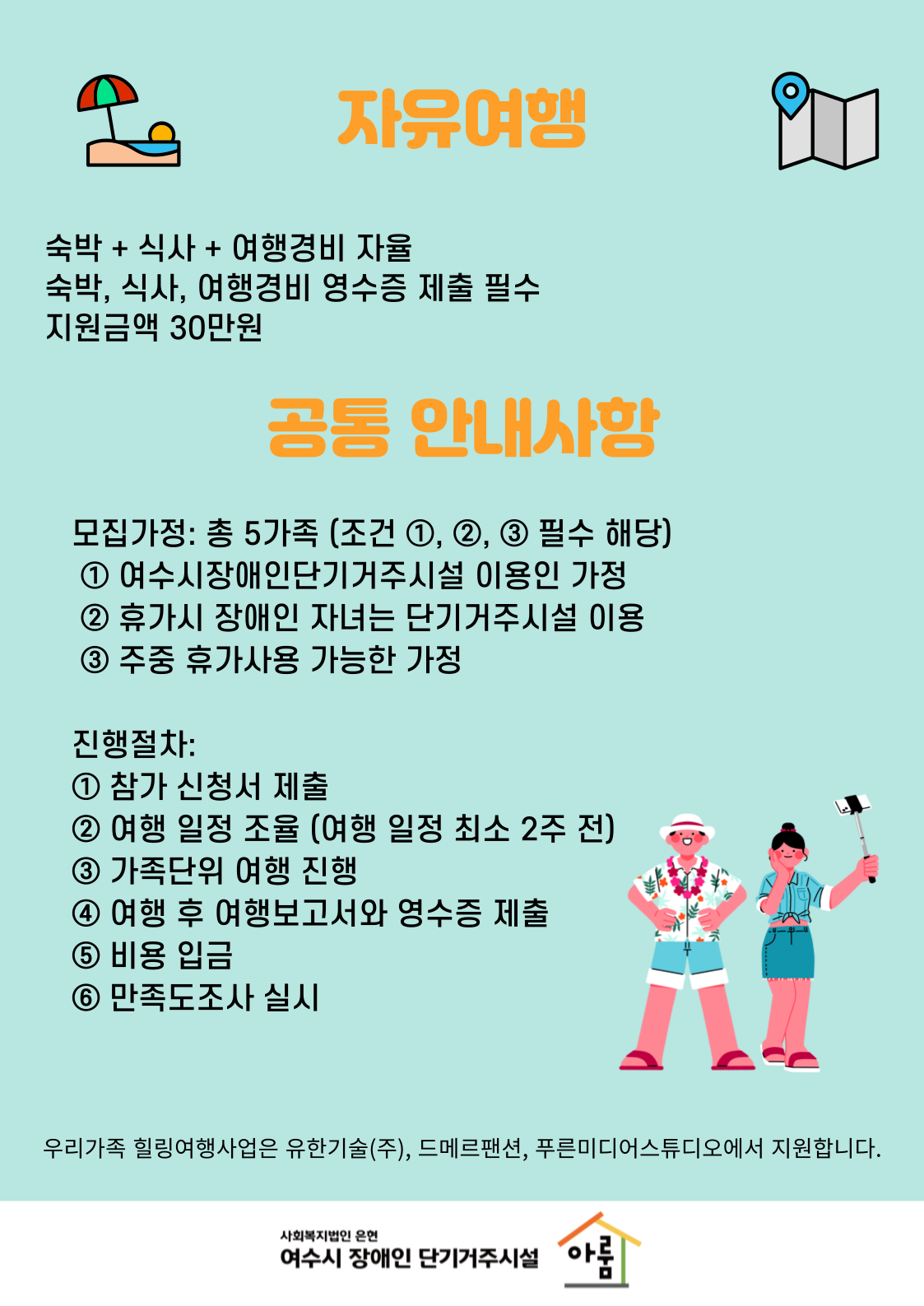 장애인을 돌보는 보호자의 단기간 휴식을 제공하여 가족기능의 회복・유지를 지원하기 위해서 2023년 우리가족 힐링여행사업을 실시합니다.