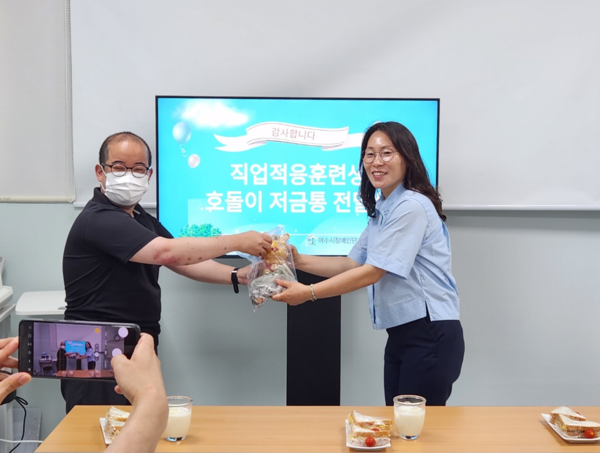 여수시장애인종합복지관 직업훈련생이 모은 저금통 여수시장애인단기거주시설에 후원
