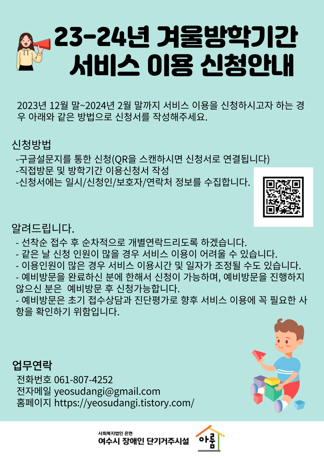 | [여수시장애인단기거주시설 이용인 모집합니다] (0) | 2023.10.30 |