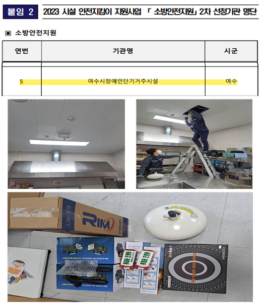 전라남도사회서비스원 덕분에  화재시 화염이나 열에 의한 화재 감지 후 소화약제를 자동적으로 방사하여 국소적으로 소화시켜주는 주방자동확산소화기와 소방훈련에 필요한 물품 구입을 통해 시설 안전에 만전을 기하였습니다.