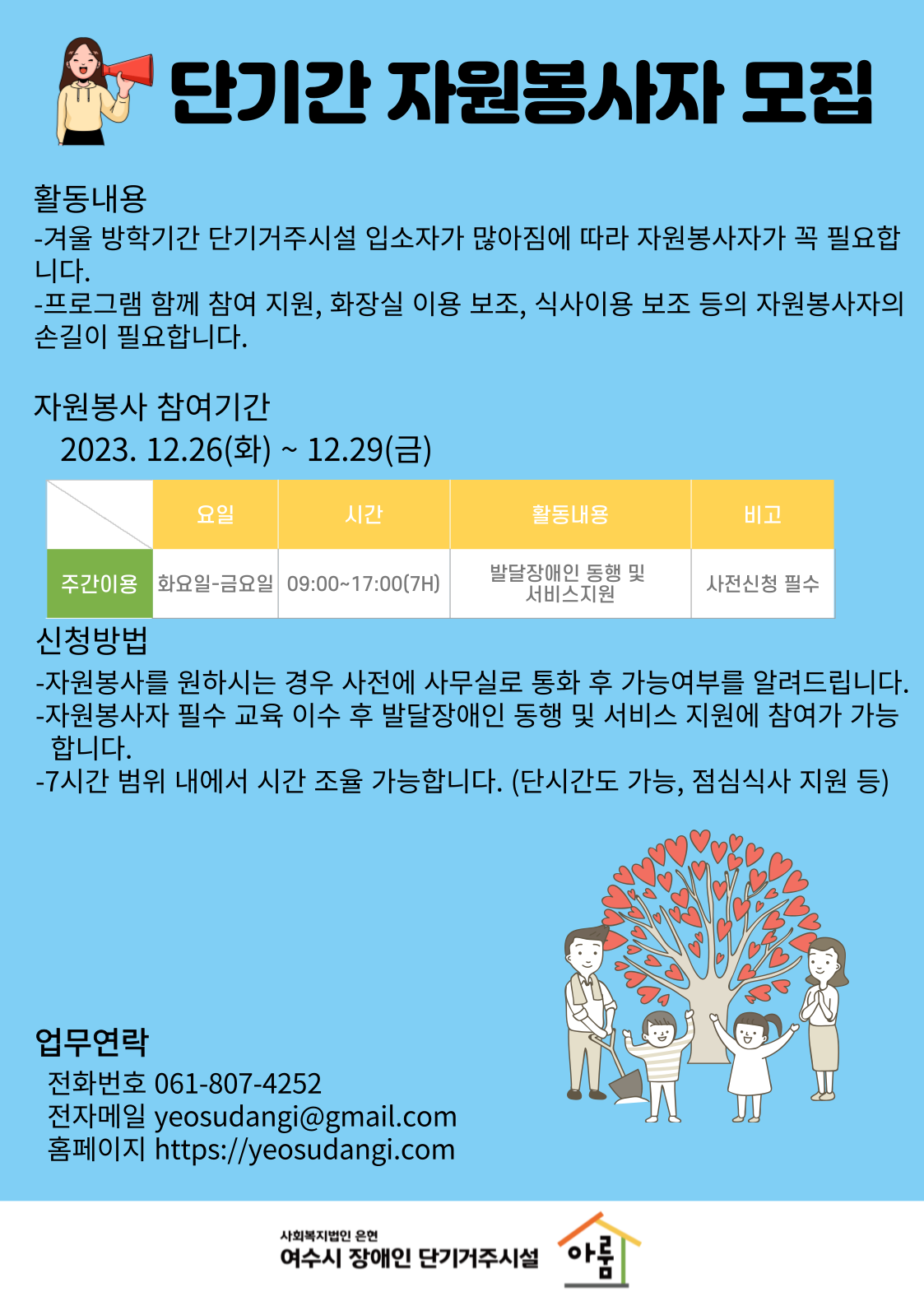 | [여수시장애인단기거주시설 이용인 모집합니다] (0) | 2023.10.30 |