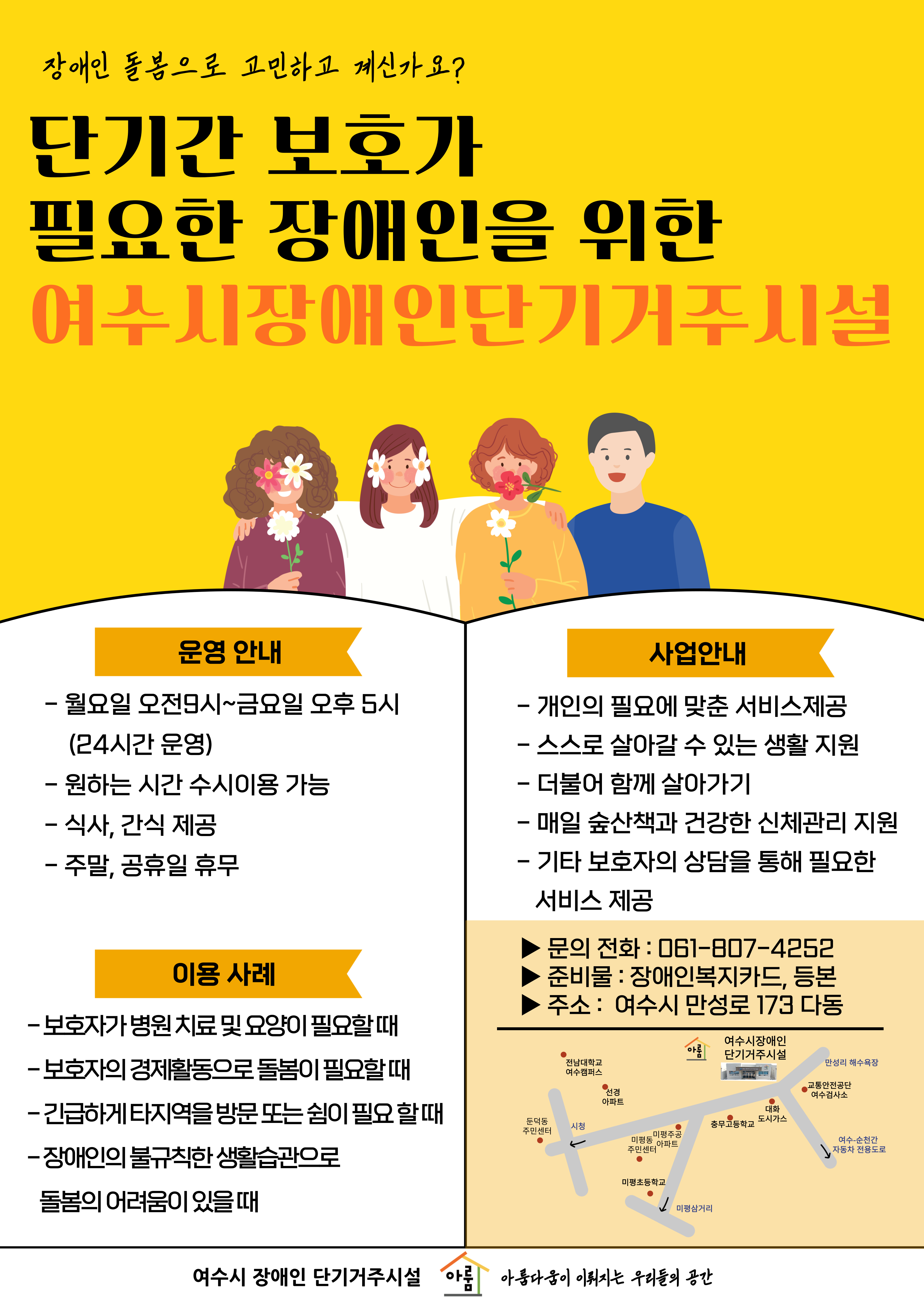 단기간 보호가 필요한 장애인을 위한 여수시장애인단기거주시설이 있습니다.