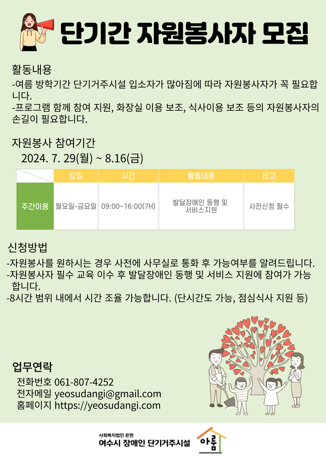 -여름 방학기간 단기거주시설 입소자가 많아짐에 따라 자원봉사자가 꼭 필요합니다.