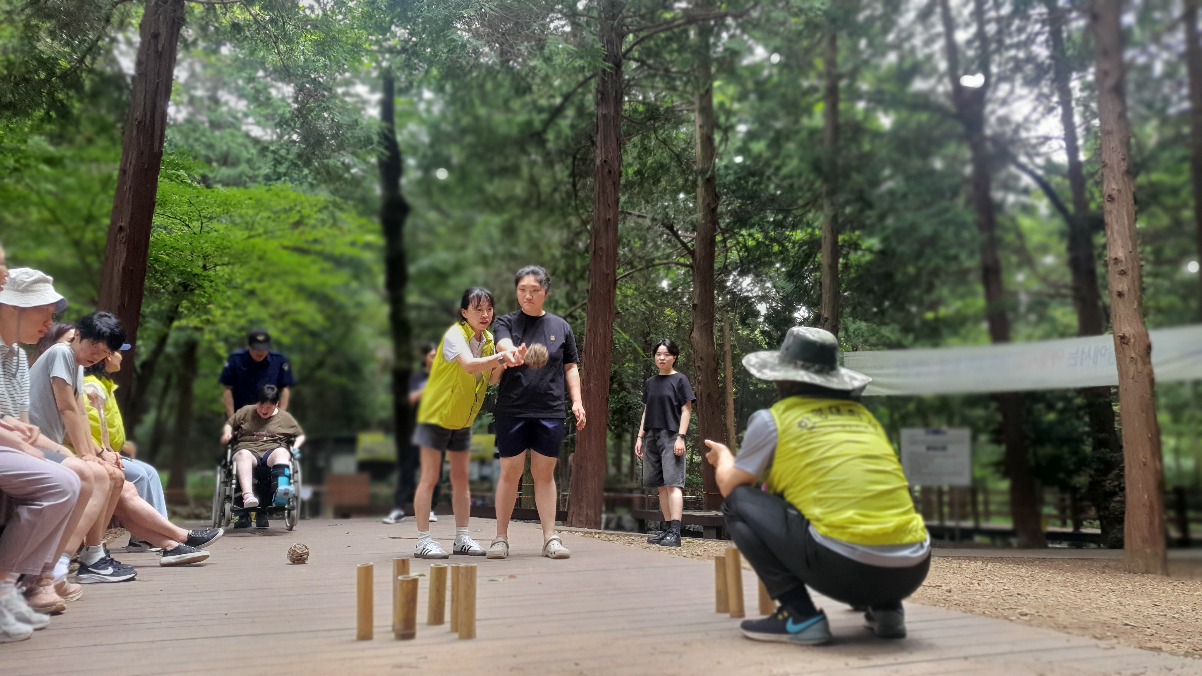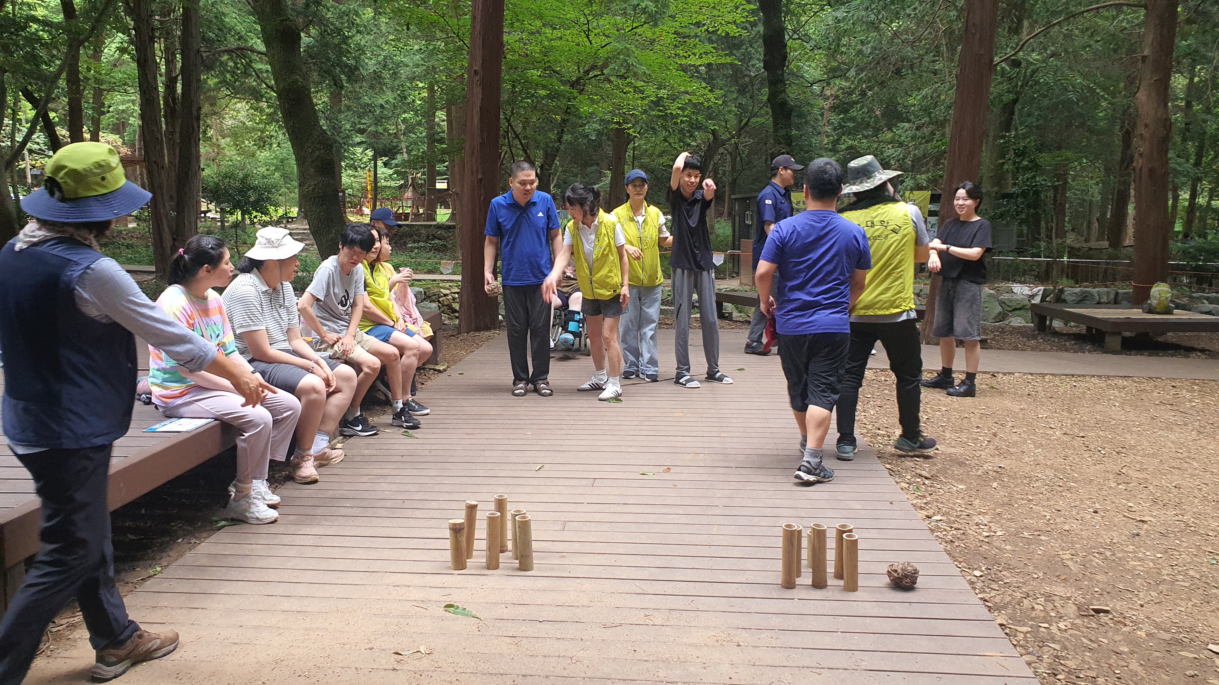 숲에서 대나무 볼링을 할 때 자원봉사자가 도움을 주고 있는 모습