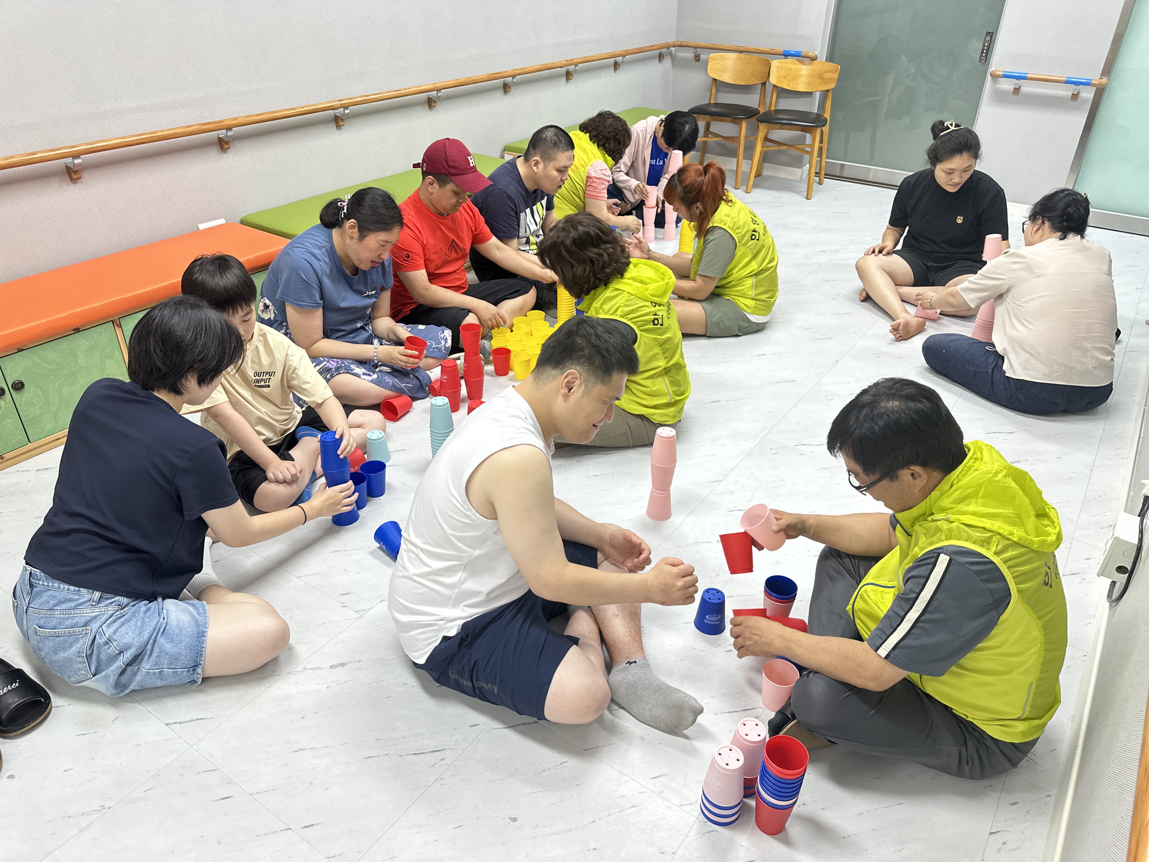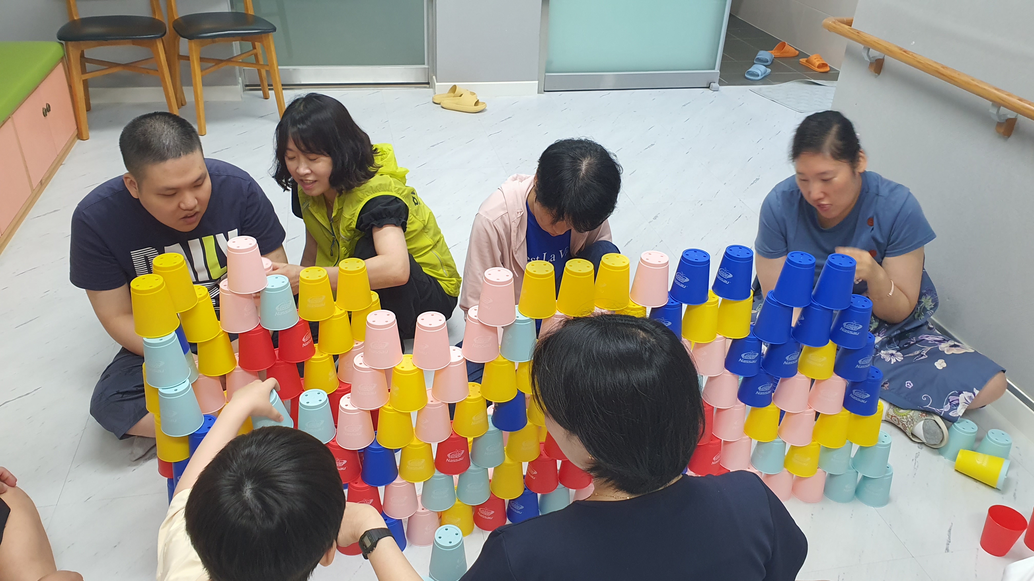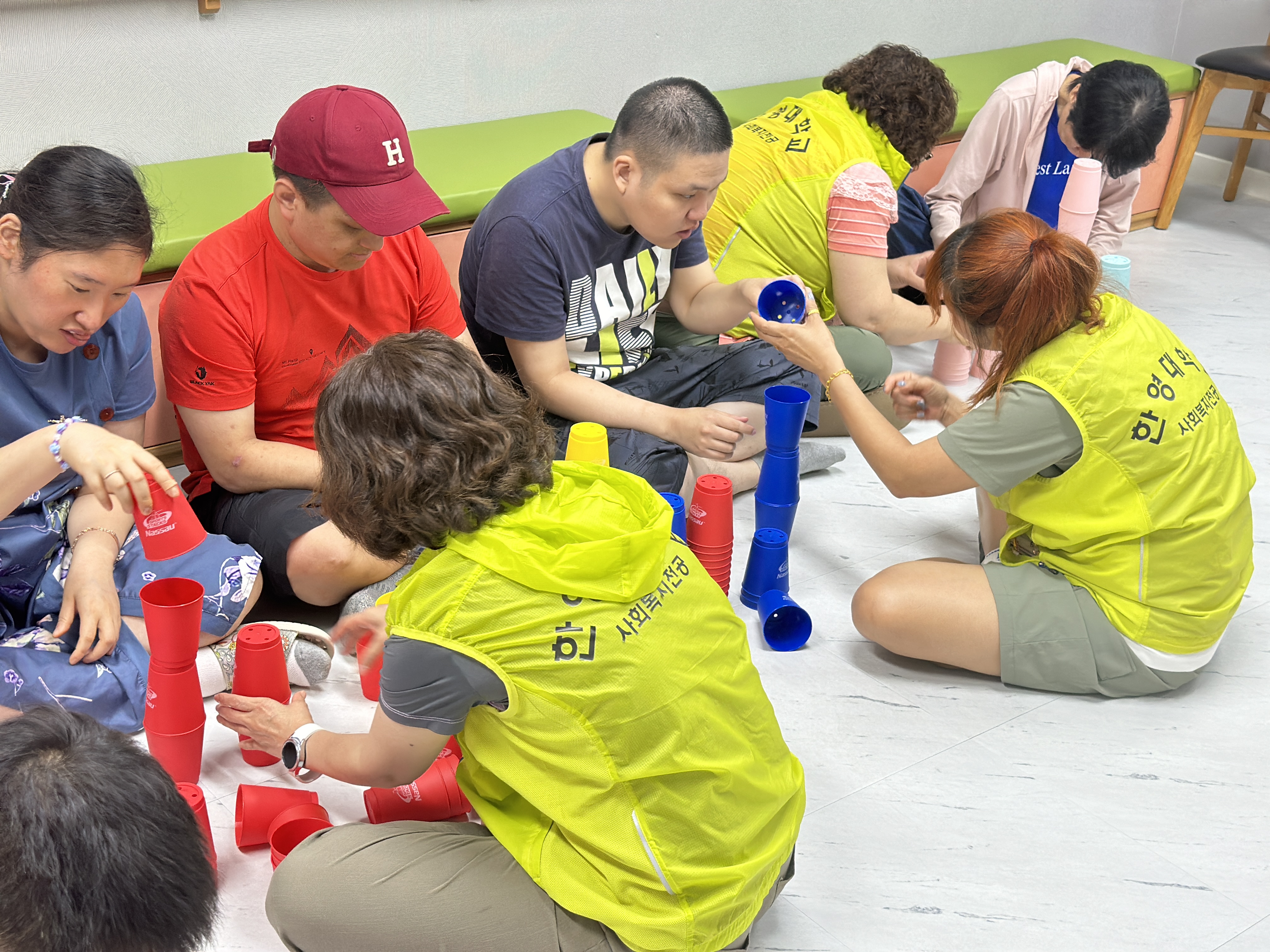 봉사자들의 환한 미소로 즐겁게 컵을 쌓는 모습