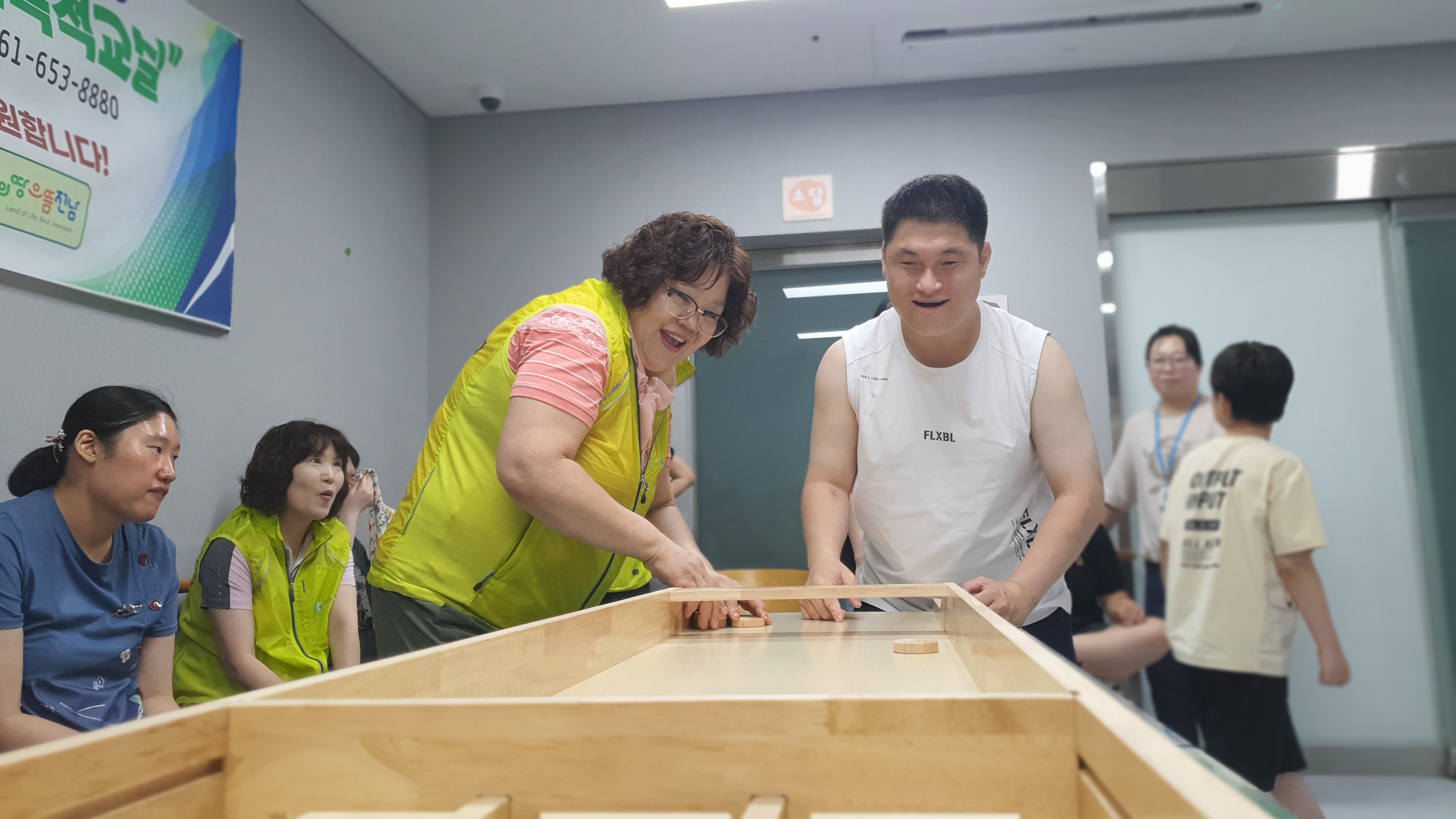 자원봉사자와 입소자가 슐런을 즐기고 있는 모습