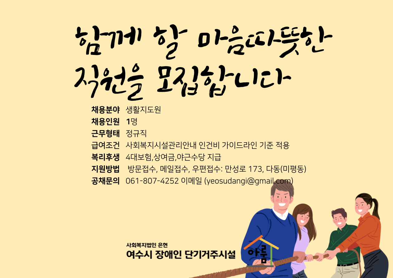 | 여수시장애인단기거주시설 직원 채용 모집 공고 (0) | 2024.07.16 |