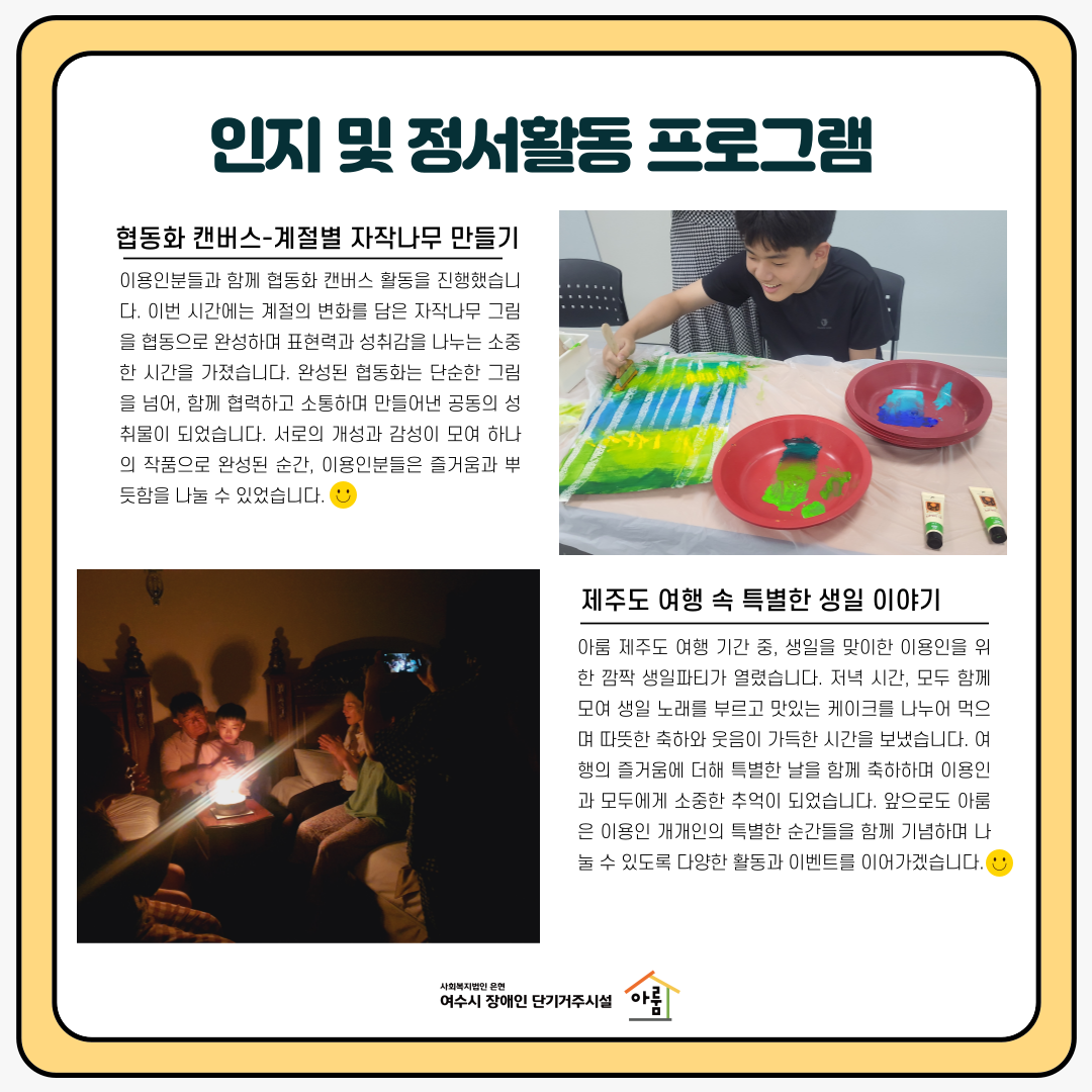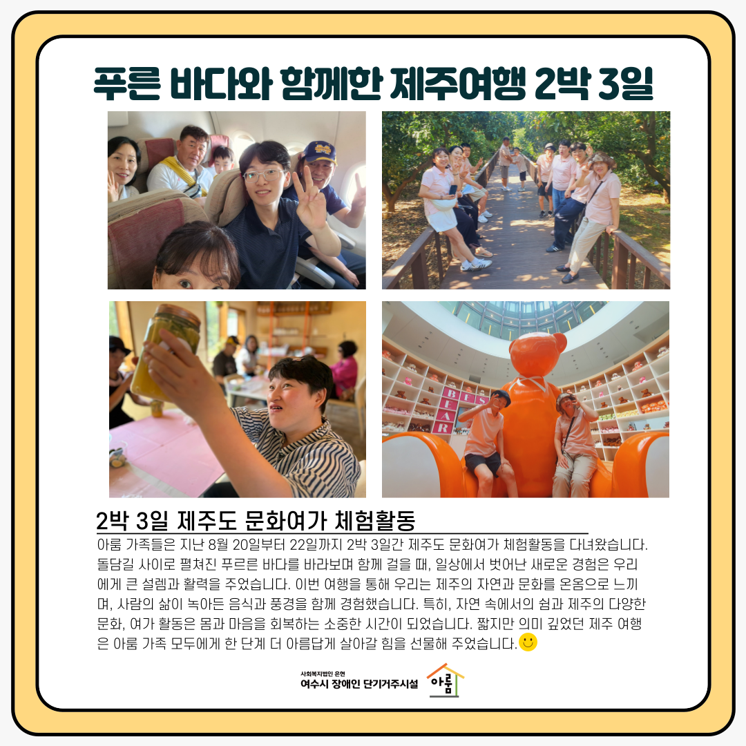 | 여수시장애인단기거주시설, 장애인 보호자를 위한 힐링여행 지원 (0) | 2025.07.31 |