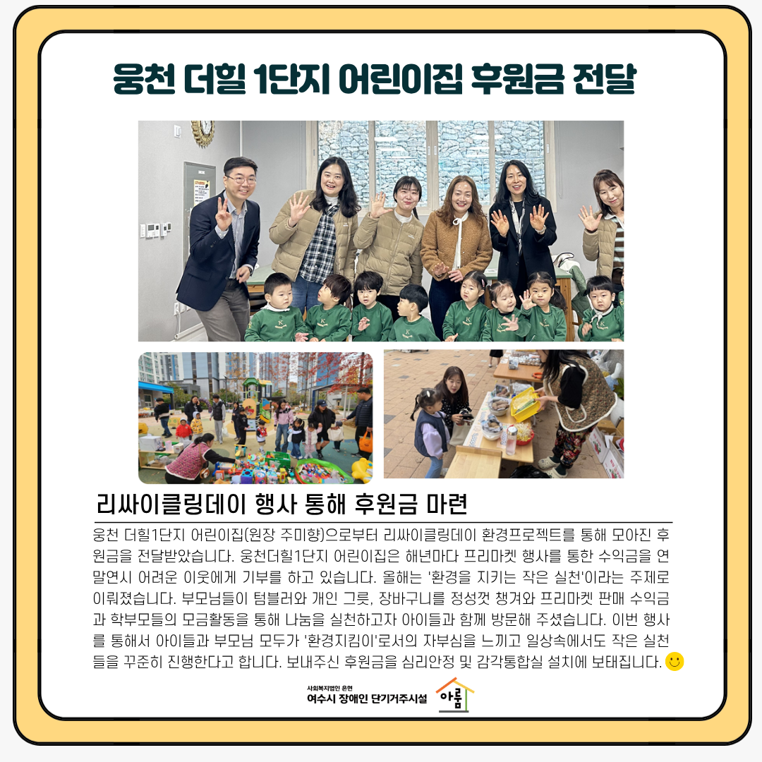 | 웅천 더힐 1단지 어린이집, 리싸이클링데이 후원금 전달 (0) | 2025.12.17 |