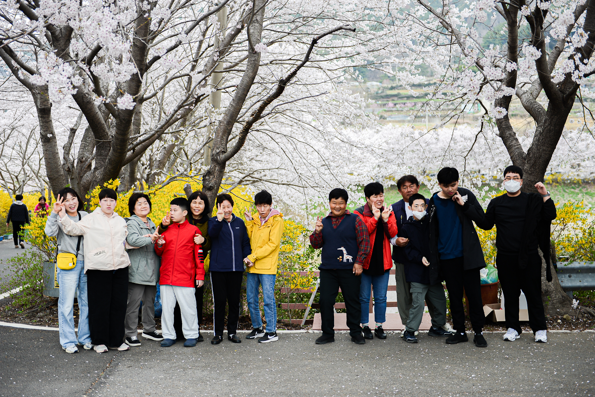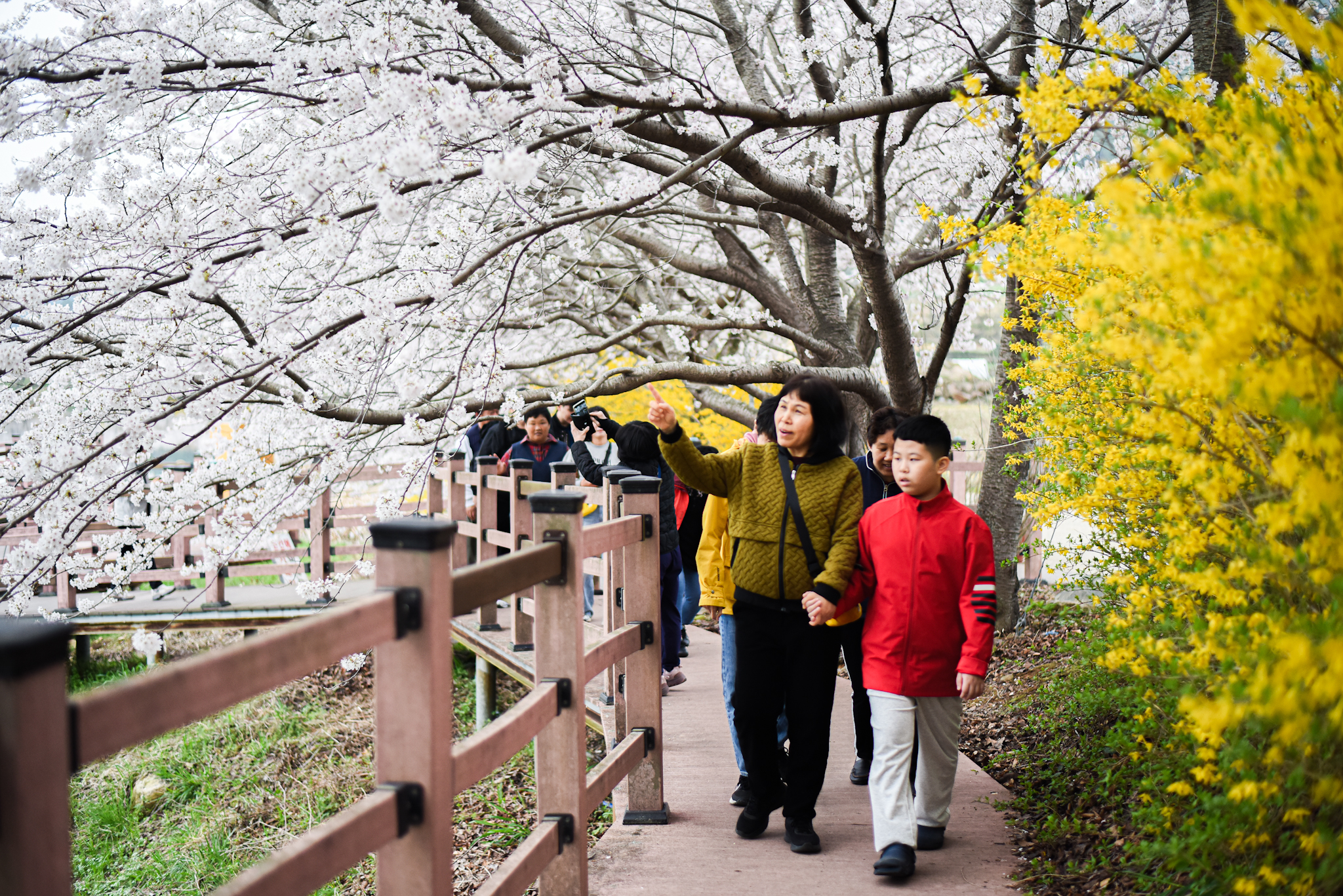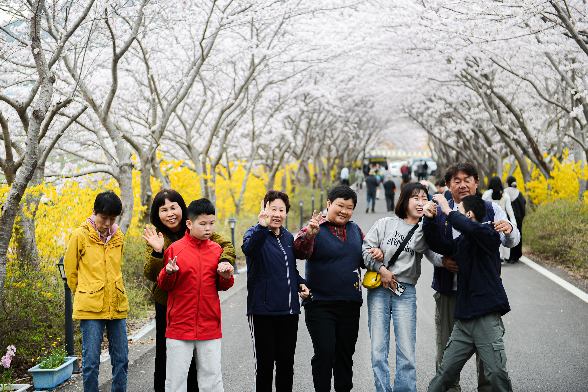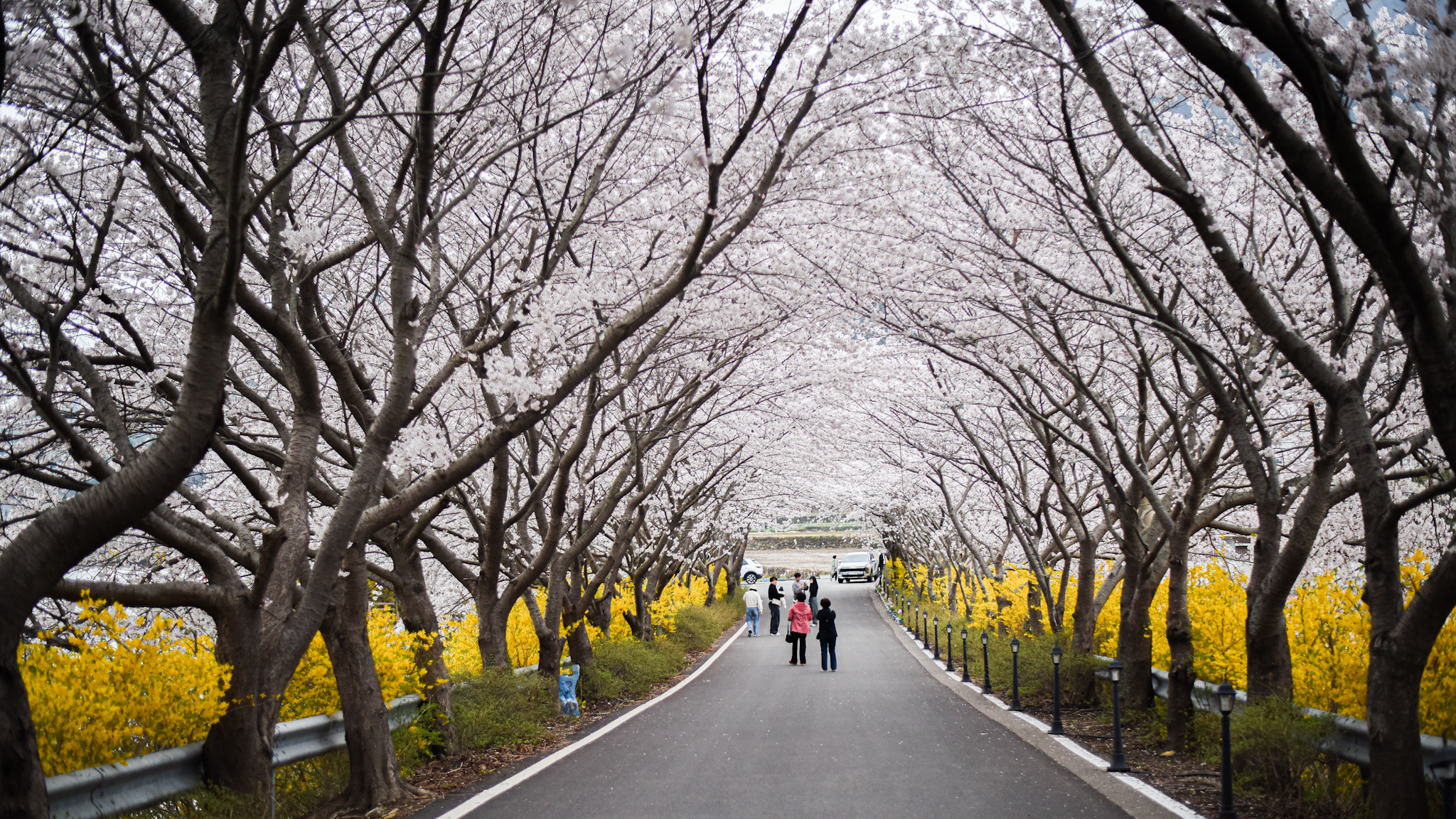 올해 봄 나들이는 여수 돌산 승월마을로! 하얀 벚꽃 터널 아래 노란 개나리가 발끝까지 따라오는 이 길,