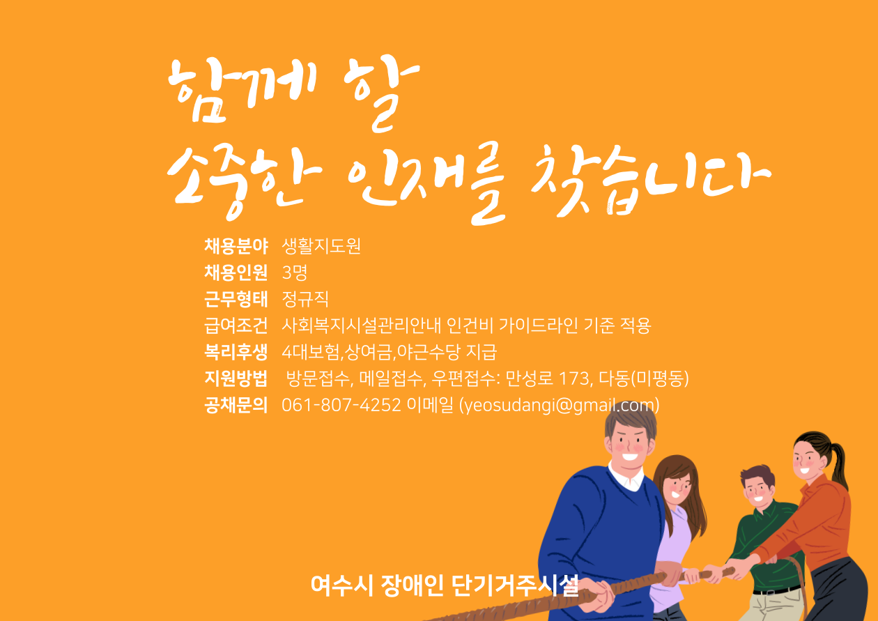 여수시 장애인 단기거주시설에서는 장애인의 일상생활 및 지역사회생활을 위해 장애인의 복지사업에 열정과 성실함으로 함께 일하실 마음 따뜻한 직원을 채용하고자 합니다.