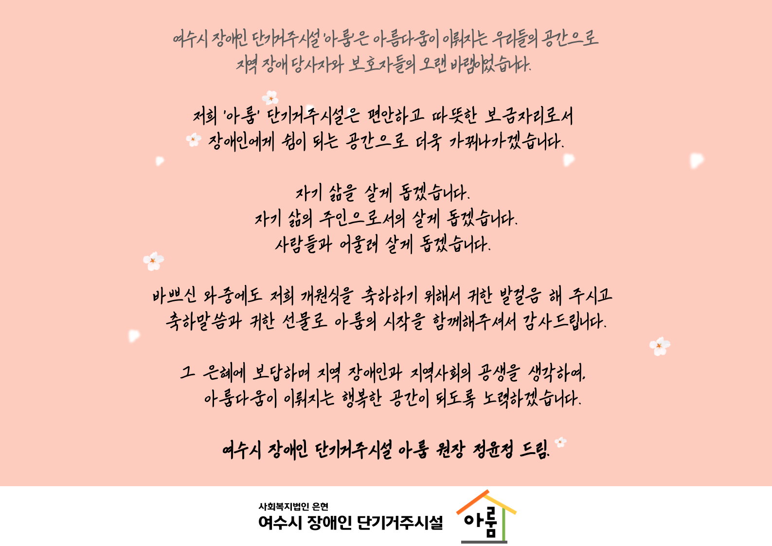 여수시 장애인 단기거주시설 아룸 원장 정윤정 드림.