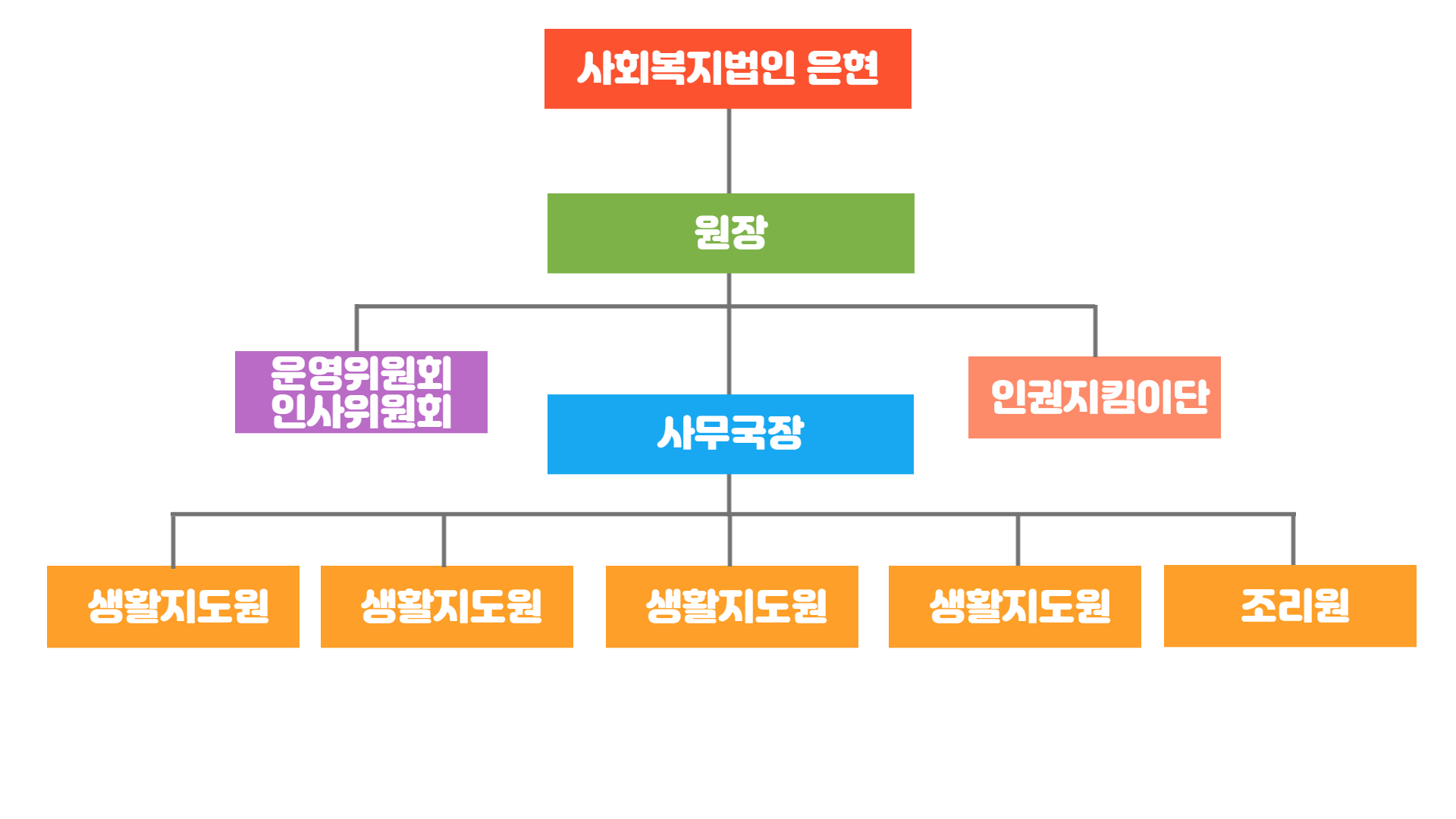 여수시장애인 단기 거주시설은 사회복지법인 은현 아래 원장을 대표자로 두고 운영위원회, 인사위원회, 인권지킴이단을 운영하며, 직원으로는 사무국장 1명, 생활지도원 4명, 조리원 1명으로 총 7명의 직원으로 구성되어 있습니다.