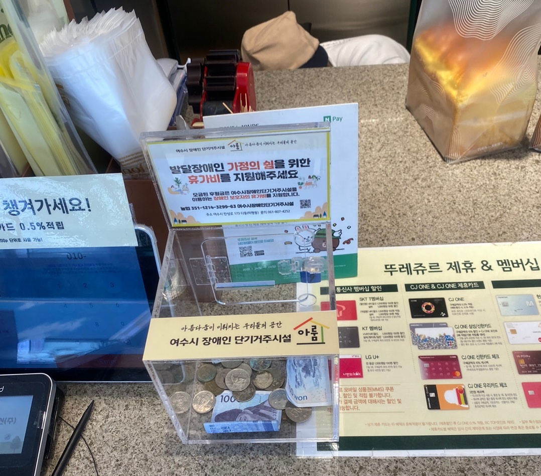 신기동 뚜레쥬르, 무선 두마리치킨집, 미평동 플라워카페 모금함이 설치되어 있습니다.